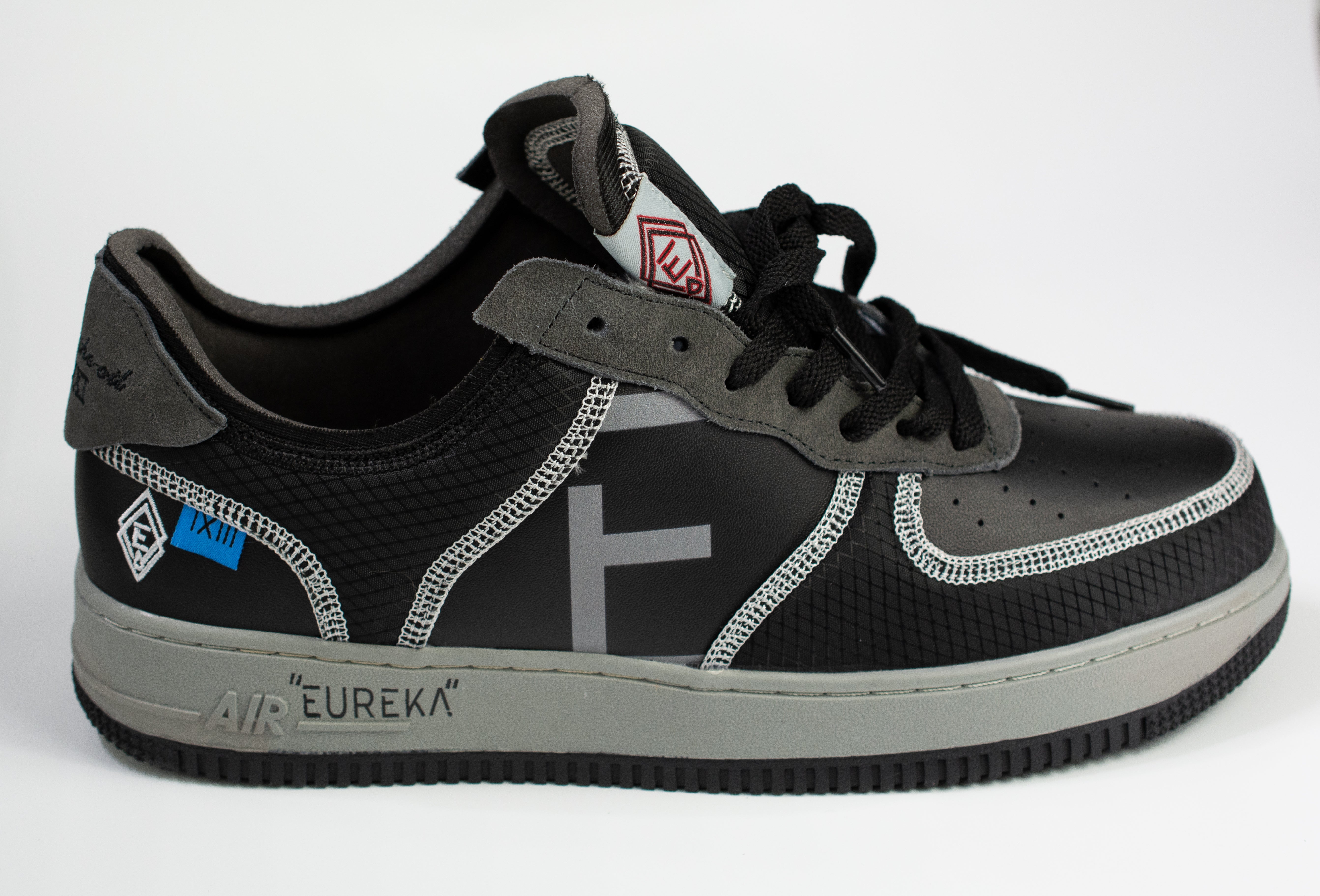 Step into the future of fashion with the iconic EUREKA Air Force 1s. Crafted to perfection, these sneakers combine genuine black leather and high-quality grey suede for an unbeatable blend of luxury and durability.
